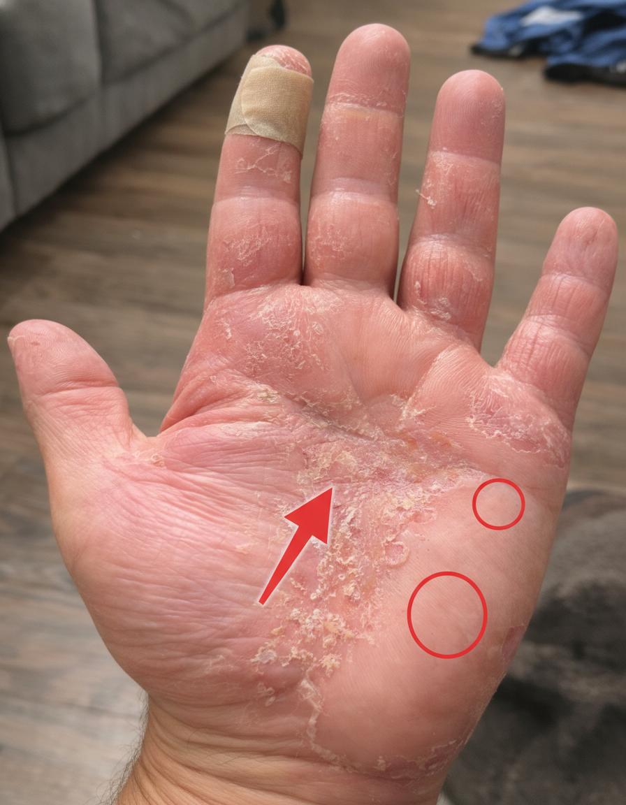 • Dryness and Scaling: Patches of dry, flaking, or peeling skin, particularly prominent between the fingers.