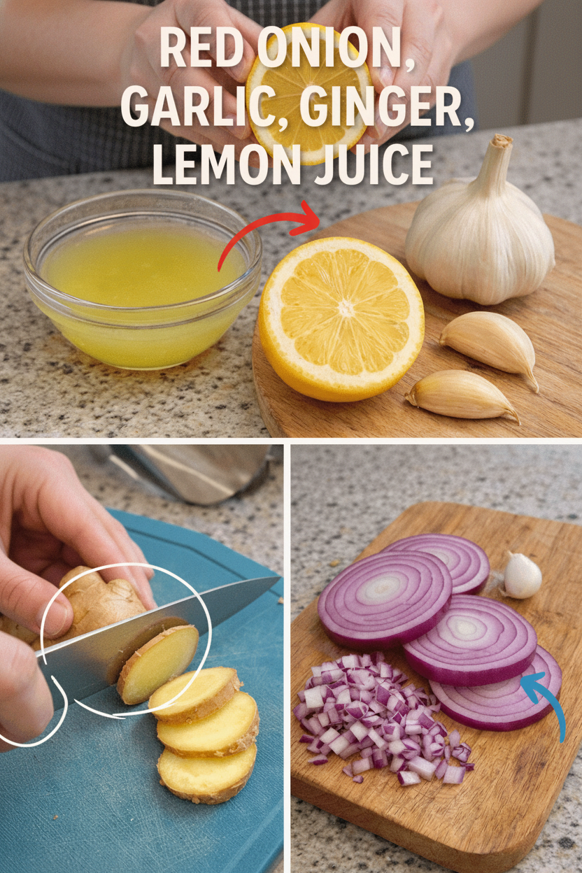 • Gather Your Essentials: You will need 1 small red onion, 4-5 cloves of fresh garlic, a thumb-sized piece of fresh ginger, and the juice from 1-2 ripe lemons.
